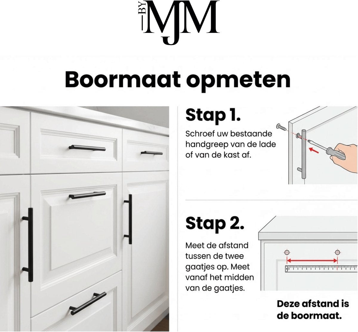 De boormaat (hart-op-hart) is de afstand tussen de middelpunten van de twee schroefgaten. Meet op uw deur of lade het midden van gat 1 tot het midden van gat 2. Veelvoorkomende maten zijn 96mm, 128mm, 160mm, 192mm en 224mm. Let op: de totale lengte van een handgreep is altijd groter dan de boormaat.