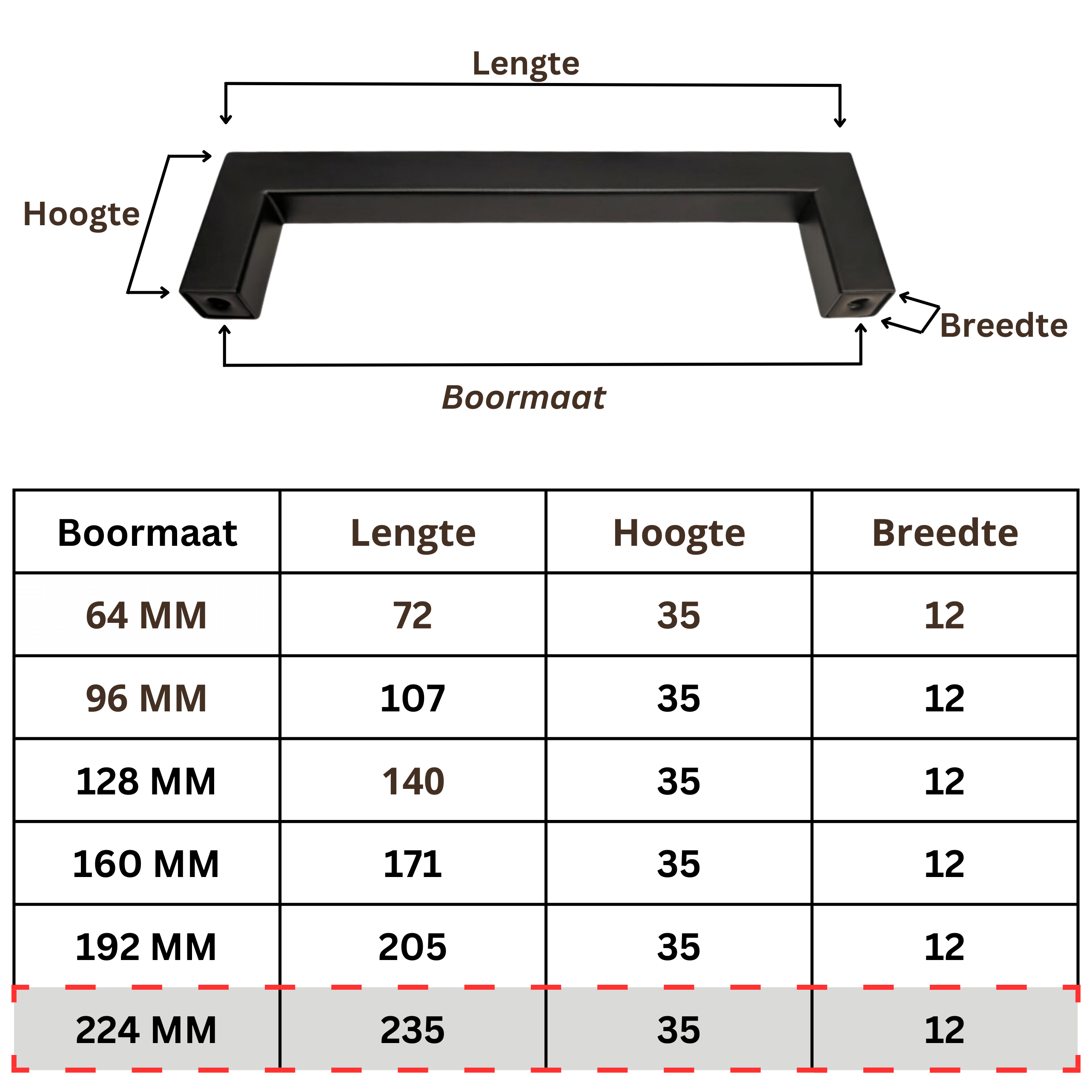 De boormaat is de afstand tussen de montagegaten. De totale lengte is de volledige buitenmaat van de greep. Voor bestaande gaten is de boormaat het belangrijkst.