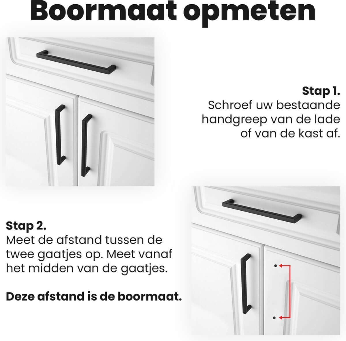 De montage is eenvoudig met de meegeleverde schroeven. Let bij het bestellen op de boorafstand (hart-op-hart): dit is de afstand tussen de gaatjes, gemeten vanuit het midden van het gaatje.